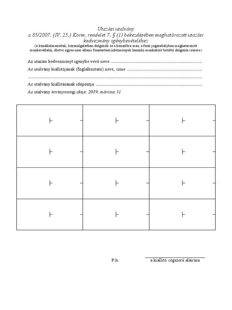 1 bekezdésében meghatározott utazási kedvezmény igénybevételéhez. Az utazási kedvezményt igénybe vevő. Utazási utalvány a 85 2007. Az utalvány kiállítójának foglalkoztató neve címe.