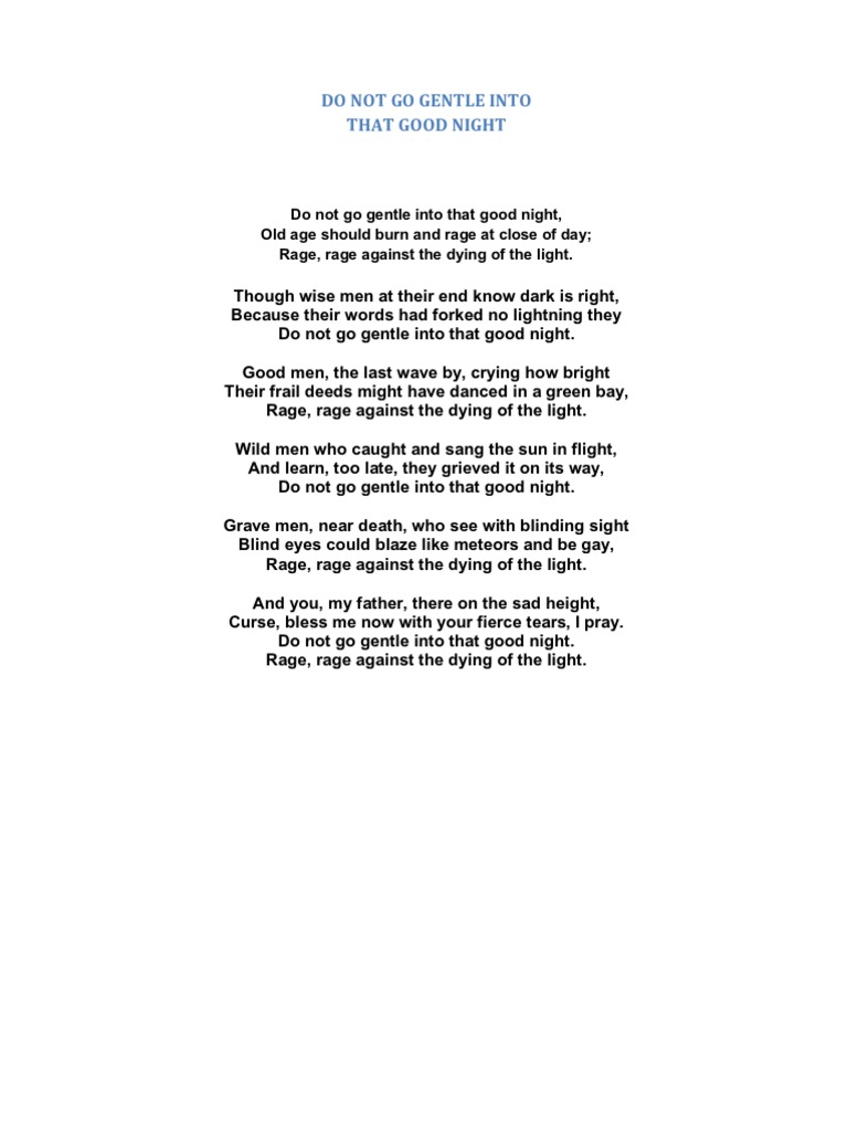 Dylan thomas do not go gentle into that good night pdf. Though wise men at their end know dark is right because their words had forked no lightning they do not go gentle into that good night. In each stanza of do not go gentle into that good night dylan thomas addresses a different aspect of the dying process before repeating one of the central refrains of the work. Do not go gentle into that good night. Do not go gentle into that good night old age should burn and rave at close of day.