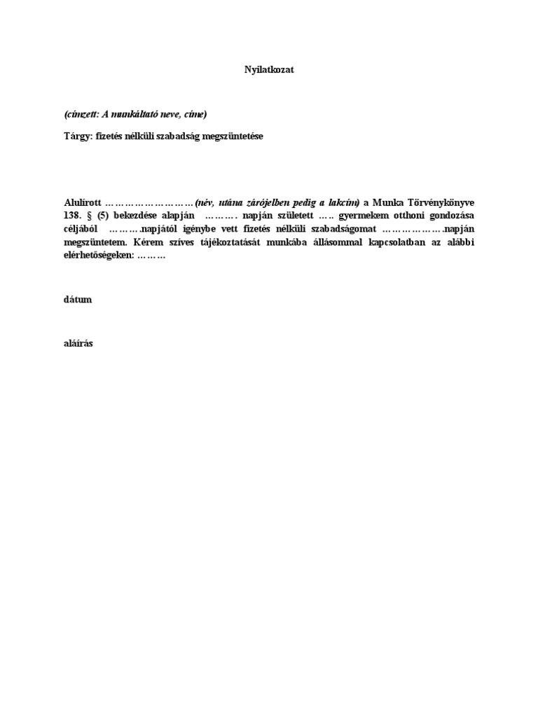 Fizetés Nélküli Szabadság Megszüntetése Minta