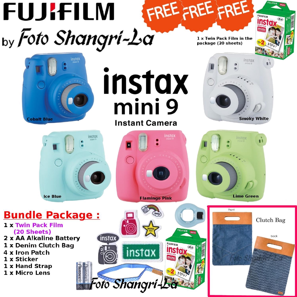 Fujifilm instax mini 9 instant camera bundle. A perfect starter setup the cobalt blue fujifilm instax mini 9 instant film camera bundle pairs the sleek instant film camera with a twin pack of instax mini film and a protective ice blue colored groovy case for the camera. Abesons 10 in 1 camera accessories bundle set for the fujifilm instax mini 9 mini 8 and mini 8 instant camera. Includes one instax mini 9 instant camera color coordinated instax groovy case one instax mini rainbow film pack a wrist strap two aa batteries and chevron clipboards. The camera has a selfie mirror for clicking perfect selfies and a detachable close up lens for perfect close up shots.